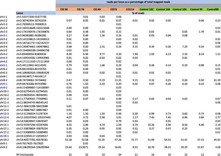 - Mapped reads (Table S3), were recalculated as the number of reads mapping to an individual HERVW ENV element relative to the total number of reads, and represented as a percentage. The HERVW loci to which an increased number of reads mapped in CIS patients are indicated in blue
